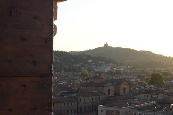 Il panorama che si gode dalla cella campanaria non ha eguali a Bologna: pur trovandosi notevolmente più in basso rispetto alla terrazza della torre Asinelli (posta ad oltre 90m di altezza), la posizione assolutamente centrale del campanile, edificato in un’area da sempre al centro dell’abitato (persino in età altomedievale, nella fase di più acuta crisi della città), rende possibile ammirare l’intero centro urbano ed i colli intorno da una prospettiva davvero privilegiata.
